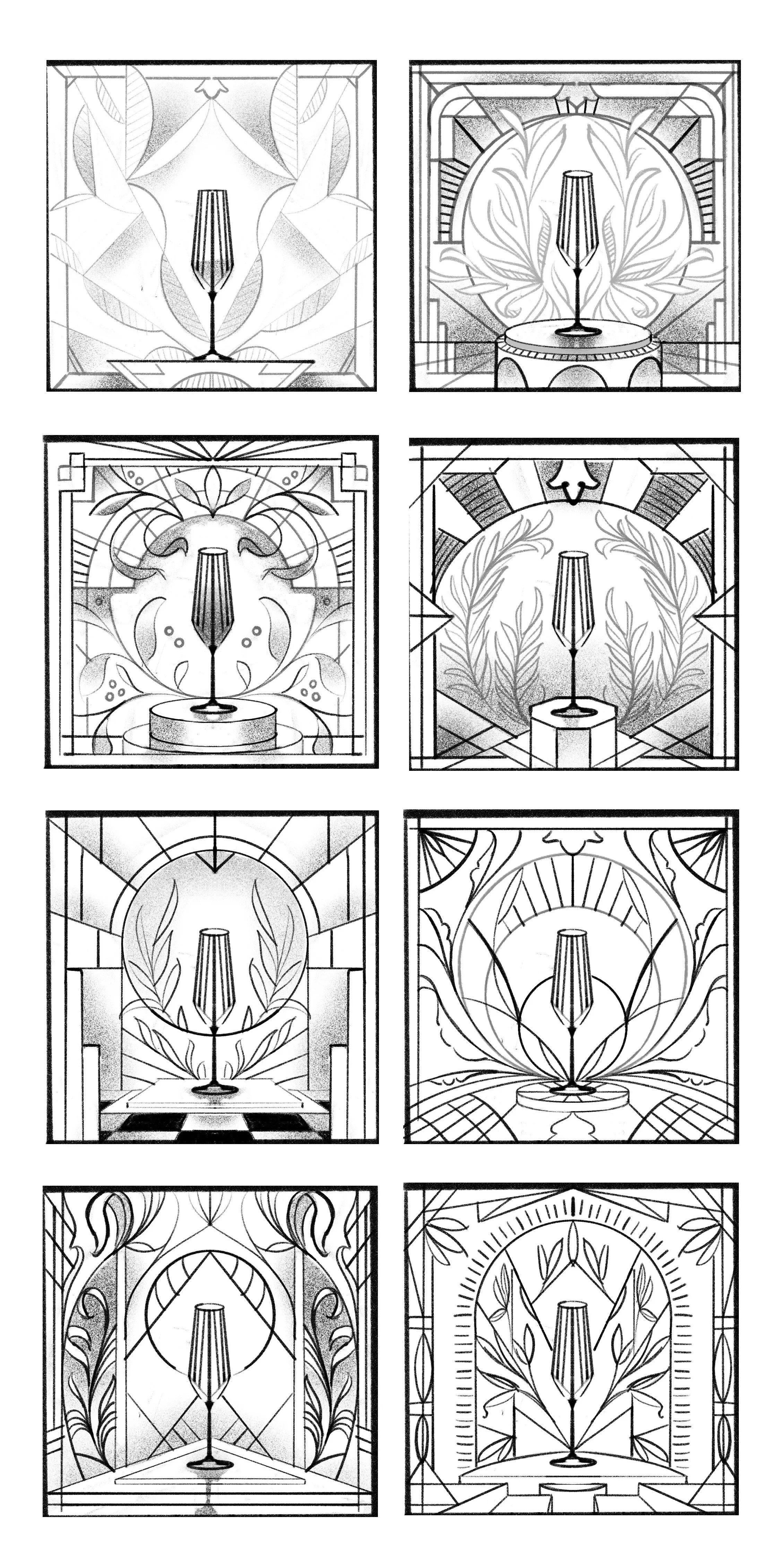 Unused style frames and sketches for a specialty liquor brand.